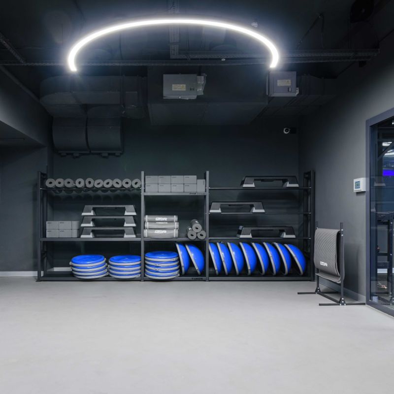 Полукольцевой светильник радиусом 1,25 метра (диаметр круга 2,5 метра) формирует ровную дугу мягкого, равномерного освещения – решение для выделения зон растяжки, коридоров или акцента над ресепшеном. Нейтральная температура 4000 K не искажает цвета оборудования и интерьера и остаётся комфортной для фото- и видеосъёмки. Конструкция состоит из двух модулей для вариативности установки и удобства транспортировки. Полукруг легко стыкуется с линейными светильниками, кольцами разного размера и такими же дугами, позволяя выстраивать цельные арки, волнообразные контуры или комбинированные фигуры для чёткого зонирования и визуального разнообразия пространства.