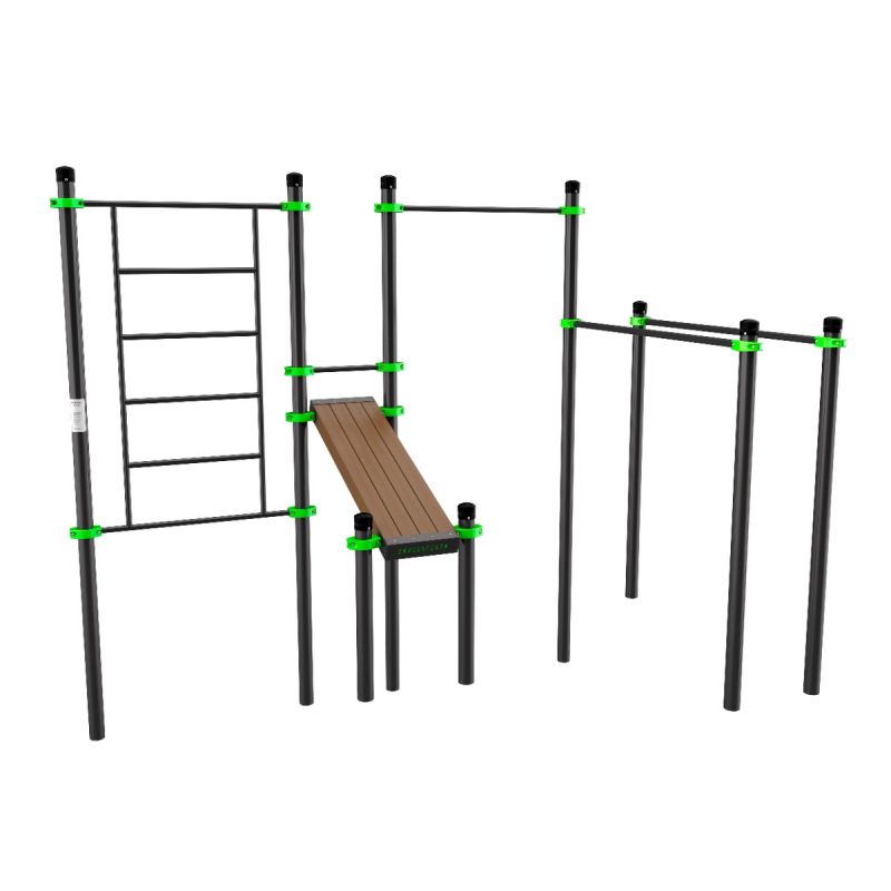 Функциональный мини-зал под открытым небом: четыре классических снаряда в одной компактной конструкции. Турник, брусья, шведская стенка и наклонная скамья дают простор для сотен упражнений – от подтягиваний до работы на пресс. На комплексе одновременно могут тренироваться четыре человека, каждый – в своей зоне, без очереди и ожидания. Идеально для интенсивных воркаутов, ГТО и базовой физподготовки.
