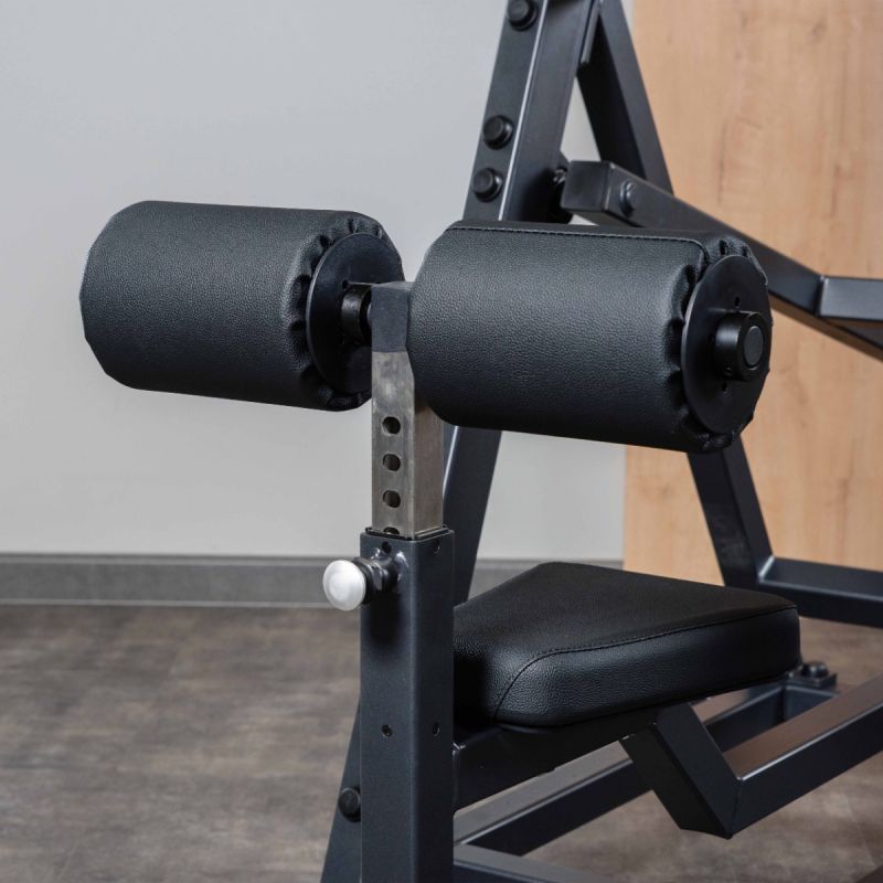- Поддерживающие валики длиной 200 мм и диаметром 140 мм вращаются вокруг собственной оси для удобства размещения ног. Высота установки валиков регулируется в восьми положениях с шагом 25 мм при помощи механического фиксатора. Расстояние между валиками: 90 мм.