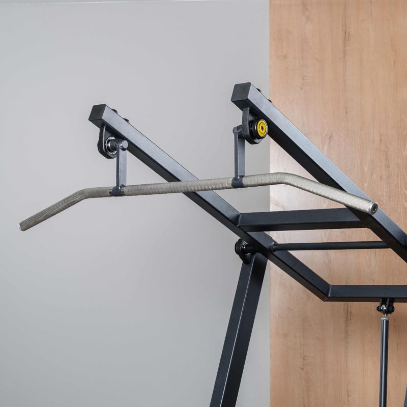 - Подвижный рычаг снабжён встроенным противовесом, компенсирующим начальную массу конструкции и обеспечивающим лёгкий старт без дополнительных дисков – это повышает комфорт и снижает нагрузку на плечевые суставы в начале упражнения.