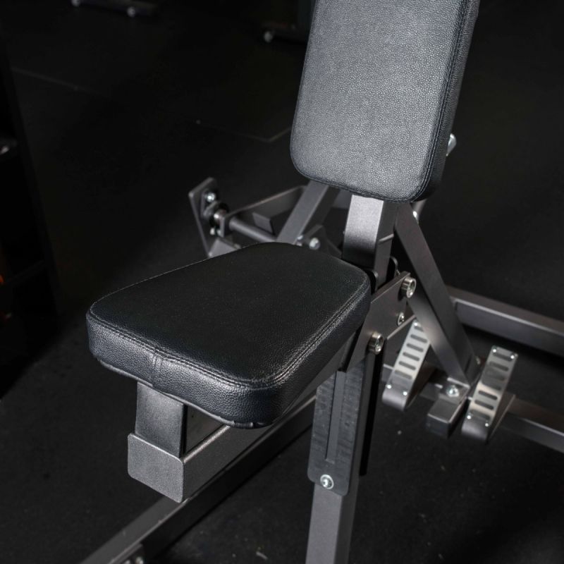 - Два хромированных накопителя на подвижных рычагах оборудованы металлическими держателями для фиксации свободных весов. Стартовое сопротивление 5 кг на один рычаг. На торцах накопителей установлены заглушки из пластика.