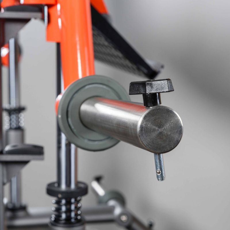 - Фиксация на нужном упоре производится при помощи перемещения металлических рукоятей длиной 350 мм, диаметром 35 мм, снабжённых торцевыми заглушками с болтовым креплением.