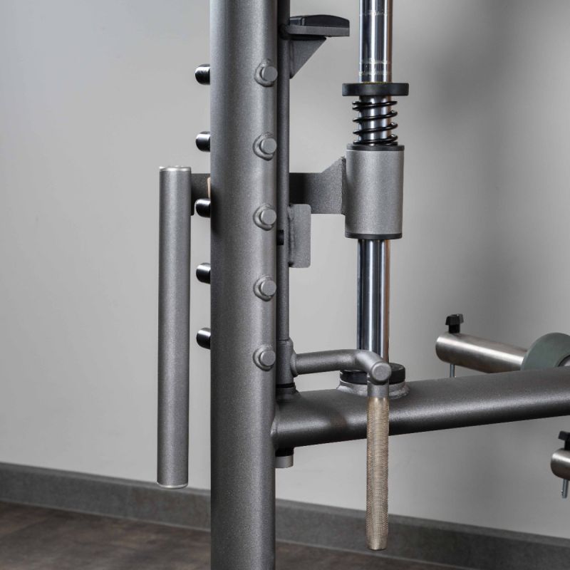 - Рукояти упора (для снятия ограничителей перед началом выполнения упражнения) длиной 175 мм и диаметр 25 мм оснащены равномерной ромбовидной накаткой для надёжного хвата и торцевыми заглушками с болтовым креплением. Рукояти упора снабжены металлическими ограничителями для предотвращения прокручивания.